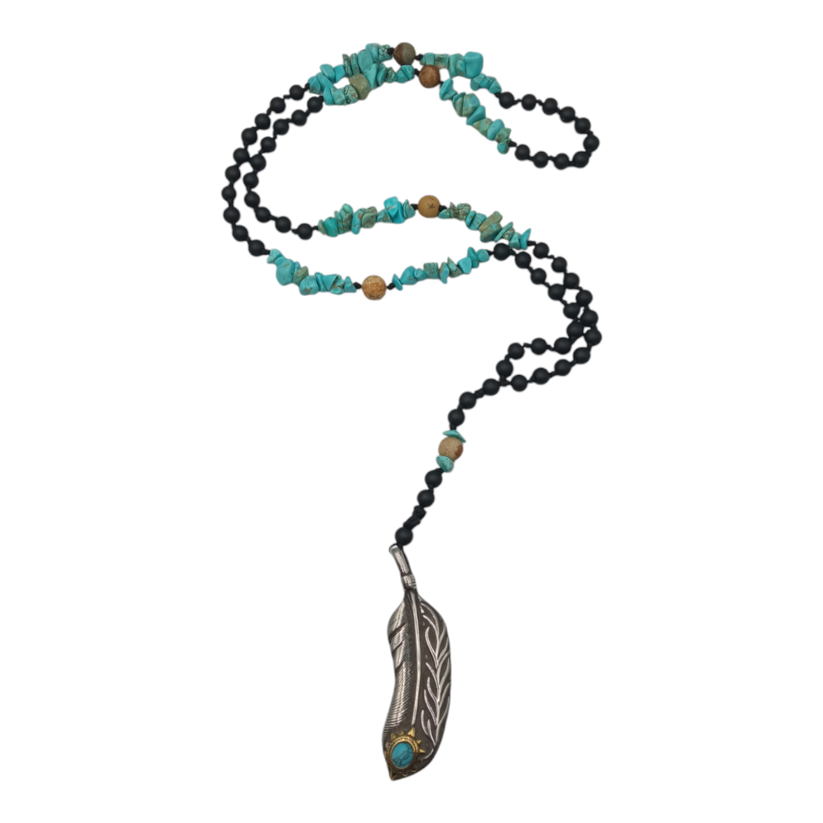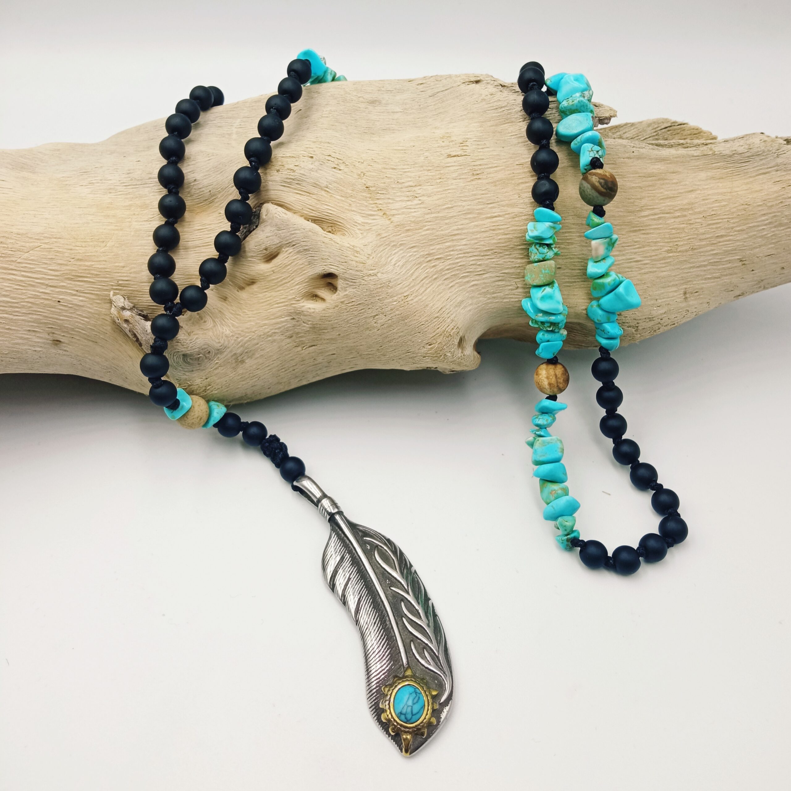 Αντρικό ροζάριο, χειροποίητο, με ημιπολύτιμες πέτρες όνυχα, τυρκουάζ, ίασπι και ατσάλινο φτερό. Μήκος: 70 + 14 εκ.